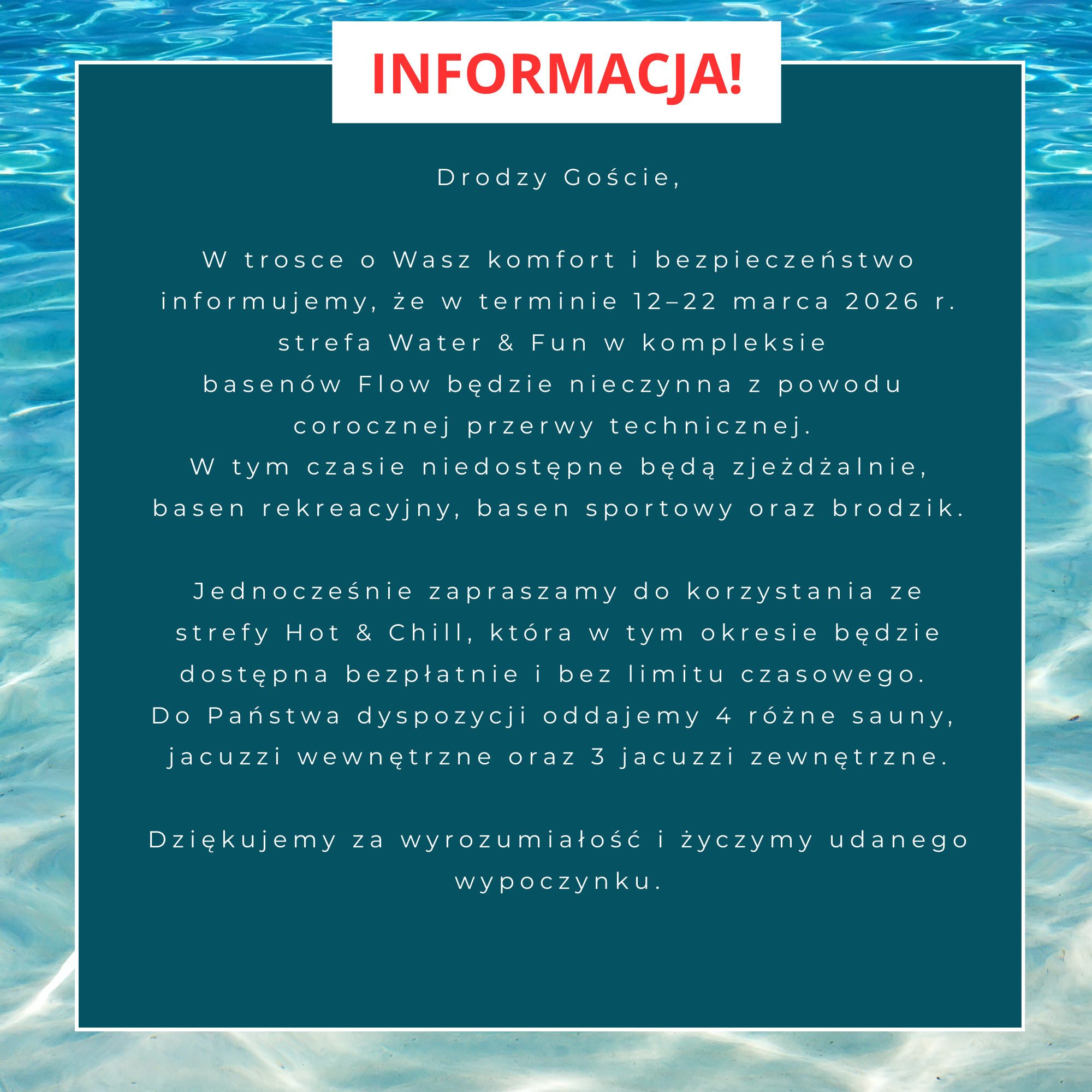 Przestrzeń basenowa podzielona jest na 2 strefy: WATER & FUN i HOT & CHILL.